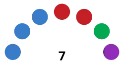 Like the mayor and vice mayors, members of the Municipal Council (called regidores) are elected every four years. Alajuelita's Municipal Council has 7 seats for regidores and their substitutes, who can participate in meetings but not vote unless the owning regidor (regidor propietario) is absent.[6] The current president of the Municipal Council is the Social Christian Unity Party member Henry David Salazar Quesada, with New Generation Party member Grettel Andrea Murillo Quirós as vice president.[9] The Municipal Council's composition for the 2024–2028 period is as follows: