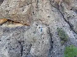 ![]() Landscape showing Alamo impact breccia (arrow) near Hancock Summit, Pahranagat Range, Nevada. | |