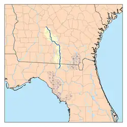 The Hernando de Soto expedition narrative records mention a "Yupaha" village they encountered after they left Apalachee, "the sound of which is suggestive of the Alapaha, a tributary of the Suwanee."[2] Another reference to a village of "Atapaha" "so closely resembles Alapaha that it is reasonable to suppose they are the same, and that the town was on the river of that name."[3] John Reed Swanton's landmark Indian Tribes of North America places the Indian village of Alapaha near where the Alapaha River met the Suwanee, and also noted that an Indian village of "Arapaja" was 70 leagues from St. Augustine, Florida, probably on the Alapaha River.[4] The Spanish mission of Santa María de Los Angeles de Arapaha was located along the lower reaches of the river from before 1630 until 1656.[5]