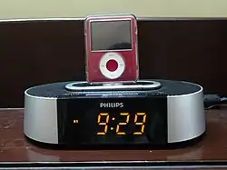 A clock radio is an alarm clock and radio receiver integrated in one device.[18] The clock may turn on the radio at a designated time to wake the user, and usually includes a buzzer alarm. Typically, clock radios are placed on the bedside stand. Some models offer dual alarm for awakening at different times and "snooze", usually a large button on the top that silences the alarm and sets it to resume sounding a few minutes later.[19] Some clock radios also have a "sleep" timer, which turns the radio on for a set amount of time (usually around one hour). This is useful for people who like to fall asleep while listening to the radio.