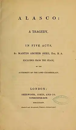 Alasco is an 1824 tragedy by Martin Archer Shee, the Irish painter and future President of the Royal Academy. While best known for his artworks Archer Shee also wrote poetry, two novels and this play. It was intended to be staged at the Theatre Royal, Covent Garden in London, but objections by the censor George Colman to the play's subject matter led to the Lord Chamberlain, the Scottish peer the Duke of Montrose to refuse it a license. Montrose and Colman were wary of any plays they regarded as touching on any revolutionary themes.[1] Archer Shee published the work with a lengthy preface defending the play, and it was performed at the unlicensed Surrey Theatre south of the River Thames in April 1824.[2]