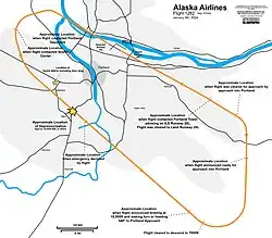 According to flight trackers, the aircraft had climbed to about 16,000 feet (4,900 m) when the accident occurred.[26] The pilots made an emergency descent to 10,000 feet (3,000 m) and returned to Portland,[27][6] where they successfully made an emergency landing at 5:27 pm.[14] Firefighters boarded the aircraft to check for injuries among the passengers.[27]