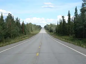 The original agreement between Canada and the United States regarding construction of the highway stipulated that its Canadian portion be turned over to Canada six months after the end of the war.[16] In the postwar settlement, Canada did not pay for the highway itself, but assumed responsibility for its ongoing maintenance; furthermore, Canada compensated the United States for associated airfields, telephone lines, and other assets.[17][18] The handover took place on April 1, 1946, when the U.S. Army transferred control of the road through Yukon and British Columbia to the Canadian Army, Northwest Highway System. The Alaskan section was completely paved during the 1960s. The lower 50 miles of the Canadian portion were paved in 1959,[19] but the remainder was largely gravel. While the entire route is now completely paved (mostly with bituminous surface treatment), as late as the mid-1980s the highway still included sections of winding dusty road sandwiched between high quality reconstructed paved segments.[20]