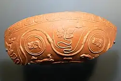 The number and variety of amphorae or amphora fragments discovered[132] provide evidence of substantial commercial transactions, with containers originating from Bética (Dressel 20 for oil) and Narbonensis (Gauloise 3/5 for wine), although locally produced types (Gauloise 12) are also identified.[133]