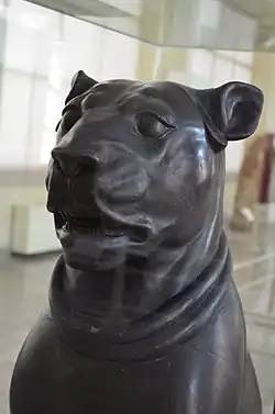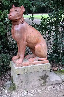 The Molossus belonged to the tribe of the Molossians, from Epirus in northern Greece in about 1200 BC, coming from the north. However, their artifacts did not resemble the Mastiff prototype, as they had a long nose of a narrow type, and a long mane. Varro, however, described a herding dog of Epirus which was white, large-headed, and slightly undershot, used to defend sheep and goats.[5] One group of Alans arrived in what is now Albania in the 5th or 6th centuries BC.[6] Molossis of Epirus is located in Southern Albania.[7] It is most plausible the Alaunt gave rise to the fighting dogs of the Molossi,[8] which were introduced to Britain by Roman invasion in 43 BC. The Alans provided cavalry for Rome, many of whom were deployed to Hadrian's Wall in the second century AD.[9]