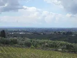 The highest peak of the town of Albano is the Colle dei Cappuccini, located at 615 m above sea level. From the hill, which houses a pine forest adjacent to the Capuchin Monastery, there is a remarkable overview of Lake Albano, Agro Romano and Monte Cavo.[7] The historic center of Albano has a maximum gradient of 11%, or 47 metres, 435, taking into consideration the distance between the Cathedral of San Pancrazio (384 m asl) and the St. Paul's Church (431 m asl). Other altitudes through the center of town are Villa Altieri, at kilometre 25 of the State Road 7 Via Appia (363 m asl) and the Church of Stella (391 m asl).[8] The hill town of Castel Savelli is 280 m above sea level, while the underlying fraction of Pavona is built at 110 m above sea level. The village of Cecchina at the railway station is located at 212 m above sea level.[7]