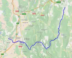 The Albarine (French pronunciation: [albaʁin] ⓘ) is a 59.4 km (36.9 mi) long river in the Ain department in Eastern France.[1] Its source is at Brénod. It flows generally southwest. It is a left tributary of the Ain, into which it flows at Châtillon-la-Palud, 40 km (25 mi) northeast of Lyon.