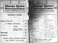It was planned and built between 1923 and 1925 and opened on 18 January 1926.[1][2] Its official name was Albergo Diurno Metropolitano and it was opened every day from 7 a.m. to 11 p.m.[3]