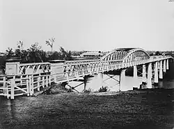The first Albert Bridge on the site was completed in June 1876[3] and enabled the Main Line railway from Grandchester to Ipswich to be extended to reach Brisbane itself.[4] In the early days of settlement, the Brisbane River at Indooroopilly provided an obstacle to the construction of a railway between Brisbane and the mining centre of Ipswich. At this time, a river boat service linked the two centres. The completion of the first Albert Bridge enabled the Ipswich railway line to open in 1875. The bridge facilitated the mass transportation of goods between Ipswich and Brisbane, which previously was only possible through shipping.[5] The first bridge was destroyed in the 1893 flood.[6][7] In the meantime, ferries were used to transport people and goods across the busy river. This, however, led to the capsize of the ferry Pearl disaster in 1896 with the loss of more than 40 lives.
