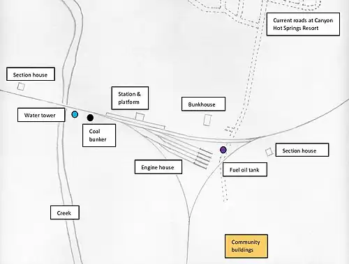 A dispatcher staffed the station telegraph office.[9] A wye and water tank existed.[11] To satisfy the anticipated mining boom, CP added a long siding westward in 1898, and lengthened the wye southward.[12] In 1910, a spark from a locomotive ignited leaves and timber near the tunnel 2 kilometres (1.25 mi) west. Initially controlled, the fire later spread, almost reaching the section house.[13] Quarries in the area provided ballast for the region.[14]