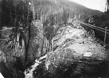 Albert Canyon, one of the original Canadian Pacific Railway (CP) stations opened to regular service in 1886, was the Rogers Pass, then Connaught Tunnel, western slope base for pusher locomotives, which predominantly assisted eastbound freight trains up the 2.5 grade.[8] The station name derives from the gorge, where the track crosses the south wall of the short box canyon on a narrow ledge.[7] All passenger trains from the late 1880s until at least 1910 made a five-minute stop[9][10] for passengers to alight and view the Illecillewaet River rushing through the 6-metre (20 ft) wide gorge 91 metres (300 ft) below. A stone parapet later replaced the wooden lookout on a rock outcrop. The final train to stop was in 1939.[7]