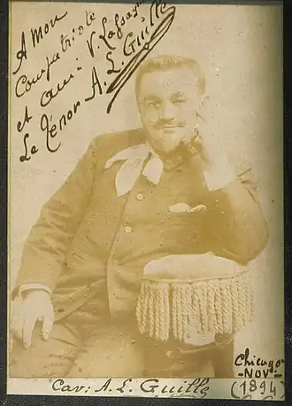 Beginning 18 November 1886 at the New York Academy of Music, Guille for six years was a tenor in the supporting cast of Adelina Patti's tours in the United States and Europe. [5] [6] At the Metropolitan Opera in New York he debuted as Lyonel in von Flotow's Martha 23 April 1892, a role he had sung in New York with Patti since 1887. He sang with the company for several seasons at Sunday concerts and galas, on tour, and as Turiddu in Mascagni's Cavalleria rusticana in spring 1894. [7]