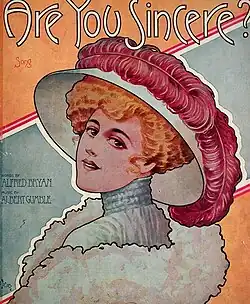 Gumble also wrote other kinds of popular songs for Tin Pan Alley most of which were also published by Remick, but also some works which were self-published. The most successful of these were the songs "The Girl Who Threw Me Down" (1907, lyricist Benjamin Hapgood Burt), "Are You Sincere?" (1908, lyricist Alfred Bryan), and "Rebecca of Sunnybrook Farm" (1914, lyricist Seymour Brown).[1] "Are You Sincere?" was a hit song for Elise Stevenson who recorded the work for the Victor Talking Machine Company in 1908.[16] His romantic ballad "On Lake Champlain", about two lovers who are paddling by moonlight at midnight on the North American Lake, was published in the 2009 anthology New York Sings: 400 Years of the Empire State In Song.[17]