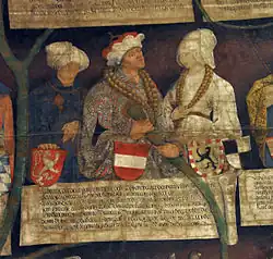 Albert III was born in the ducal residence of Vienna, the third son of the Habsburg duke Albert II of Austria and his wife Joanna of Pfirt.[1] Even though his father had determined a house law, whereby the four sons were obliged to rule jointly and equally, the eldest brother Rudolf IV assumed the reins of government after his father's death in 1358. He reaffirmed his supremacy issuing the Privilegium Maius. However, as his marriage remained childless he again had to share his power with his younger brothers. In 1365 Rudolf IV, Albert III, and Leopold III together signed the foundation certificate of the Vienna University (Alma Mater Rudolphina Vindobonensis); Rudolf died a few months later at the age of 25.