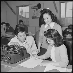 In 1942, when Saijo was 15 years old, he and his family were removed from their California home and imprisoned at Pomona Assembly Center, then transferred to Heart Mountain Relocation Center, as part of the U.S. government's program of Japanese American internment.[1][3] While at Heart Mountain Saijo attended high school and worked as a janitor.[4] In 1942, Saijo began to write for his high school newspaper, the Heart Mountain Echoes.[5] His first feature article, entitled "Me and December 7", was published on the first anniversary of the 1941 Attack on Pearl Harbor, and addressed his memories of shock and disorientation surrounding the attack, and his fears that he would be treated differently by non-Japanese friends and teachers as a result.[6] The article also argued against the significance of race and expressed opposition to the Nazi theory of the master race.[7] In his writing of this period, Saijo expressed a commitment to the United States as a melting pot and support for those who volunteered for the U.S. Armed Forces.[8] The historian Michael Masatsugu has argued that while Saijo did challenge the racial essentialist construction of Japanese Americans that was used to justify their internment, his arguments regarding the irrelevance of race and his call for Japanese Americans to assimilate were consistent with the approach of the War Relocation Authority (WRA).[8] Masatsugu observes that this was not a coincidence: Saijo and other writers were supervised by WRA officials, and Masatsugu argues that this supervision was a form of surveillance and censorship.[8]