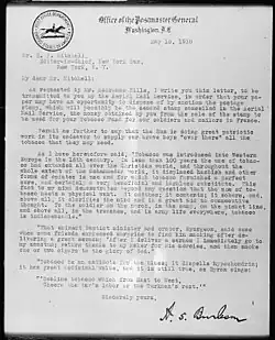 Burleson played a major role in securing the Texas delegation for Woodrow Wilson in 1912, and he became one of the President's most trusted advisors.[3] In 1913, he was appointed Postmaster General. To his credit, he initiated the parcel post and air mail services, increasing mail service to rural areas.[4] Samuel Walker states, "Burleson holds the dubious distinction of being the worst member of the entire Wilson administration on civil liberties."[5] According to historian G. J. Meyer, Burleson "has been called the worst postmaster general in American history, but that is unfair; he introduced parcel post and airmail and improved rural service. It is fair to say, however, that he may have been the worst human being ever to serve as postmaster general".[4]