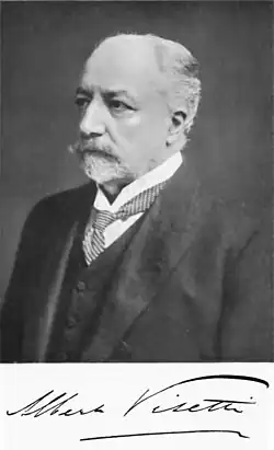 Visetti moved to England in May 1871 after the turmoil of the Siege of Paris, living there for the rest of his life, being naturalised in 1884.[2] Here he became a champion of English music and musicians, arranging for the works of such composers as Arthur Sullivan, William Sterndale Bennett and Charles Villiers Stanford to be performed for the first time at La Scala in Milan and in Rome and Naples.[2][4]