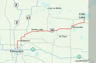 Highway 28 is a 293-kilometre (182 mi) highway in north-central Alberta, Canada that connects Edmonton to Cold Lake. It begins at Yellowhead Trail (Highway 16) in Edmonton as 97 Street NW, running through the city's north suburbs before entering Sturgeon County and passing CFB Edmonton. After merging with Highway 28A near Gibbons it winds through agricultural lands of north-central Alberta, roughly paralleling the North Saskatchewan River until Smoky Lake before continuing east through St. Paul County to Bonnyville.[2] It turns northeast to CFB Cold Lake, before ending at Lakeshore Drive in the city of Cold Lake shortly thereafter.[3]