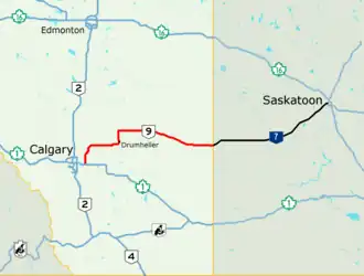 Highway 9 is a highway in south-central Alberta, Canada, which together with Saskatchewan Highway 7 connects Calgary to Saskatoon, Saskatchewan via Drumheller. It is designated as a core route of the National Highway System, forming a portion of an interprovincial corridor.[2] Highway 9 spans approximately 324 km (201 mi) from the Trans-Canada Highway (Highway 1) east of Calgary to Alberta's border with Saskatchewan.[1][3][4]