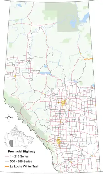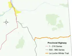 Highway 956 is a proposed 65-kilometre (40 mi) all-weather road that will extend from Highway 881, 25 kilometres (16 mi) south of Anzac and 75 kilometres (47 mi) south of Fort McMurray, to the Saskatchewan border where will connect with Saskatchewan Highway 956 and continue to La Loche. The route is currently a winter road known as the La Loche Winter Trail and maintained by the Regional Municipality of Wood Buffalo.[4] Highway 956 is the in the planning phase for 2025.[2][5] The Government of Alberta's proposed 2025 budget will allocate $7 million for construction if approved.[1] Unlike other 900-series highways in Alberta, Highway 956 is not related to Highway 56, rather getting its number from its Saskatchewan counterpart.