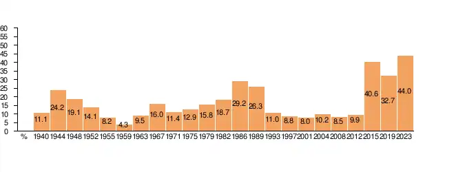 | 1948 | 56,387 | 19.1 | 2 / 57