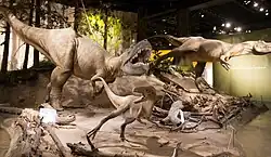 There is plentiful evidence for gregarious behaviour among herbivorous dinosaurs, including ceratopsians and hadrosaurs.[49] However, only rarely are so many dinosaurian predators found at the same site. Small theropods, like Deinonychus[50] and Coelophysis,[51] have been found in aggregations, as have larger predators, such as Allosaurus and Mapusaurus.[52] There is some evidence of gregarious behaviour in other tyrannosaurids as well, as fragmentary remains of smaller individuals were found alongside "Sue", the Tyrannosaurus mounted in the Field Museum of Natural History in Chicago, and a bonebed in the Two Medicine Formation of Montana contains at least three specimens of Daspletosaurus preserved alongside several hadrosaurs.[53] These findings may corroborate the evidence for social behaviour in Albertosaurus, although some or all of the above localities may represent temporary or unnatural aggregations.[14] Others have speculated that, instead of social groups, at least some of these finds represent Komodo dragon-like mobbing of carcasses, where aggressive competition leads to some of the predators being killed and even cannibalized.[46] The evidence of cannibalism was later reported in 2024 by Coppock and Currie.[54]