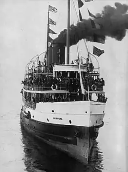 On August 2, 1910, at about 11:00, Albion was involved in a collision with the much larger, steel-hulled steamer Chippewa. At 906 gross tons, Chippewa was six times the size of Albion.[3] Chippewa was coming from Bellingham, Washington to Seattle and had reached the West Point at the northern entrance to Elliott Bay when the collision occurred. Albion was then en route from Seattle to Port Angeles, and many of her passengers were asleep in cabins at the time of the collision.[4]