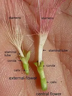 The flowers bloom throughout the summer in dense inflorescences, which resemble starbursts of pink silky threads. The true flowers have small calyx and corolla (except the central ones), with a tight cluster of prominent stamens, 2–3 cm long and white or pink with a white base. They have been observed to attract bees, butterflies and hummingbirds.[2] Its fruit is a flat brown pod 10–20 cm (4–8 in) long and 2–2.5 cm (0.8–1.0 in) broad, containing several seeds inside.