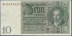 His portrait appeared on the 10 ℛ︁ℳ︁ banknote issued by the Reichsbank from 1929 until 1945. Printing ceased in 1945 but the note remained in circulation until the issue of the Deutsche Mark on 21 June 1948.
