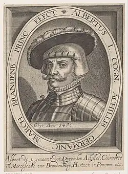 Albrecht III (9 November 1414 – 11 March 1486) was Elector of Brandenburg from 1471 until his death, the third from the House of Hohenzollern. A member of the Order of the Swan, he received the cognomen Achilles because of his knightly qualities and virtues. He also ruled in the Franconian principalities of Ansbach from 1440 and Kulmbach from 1464 (as Albrecht I).