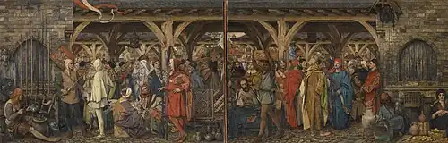 Albrecht De Vriendt principal subject matter was the glorious Belgian and Flemish history from the 15th to 17th centuries. He thus continued the tradition of the Belgian Romantic-historical school who chose as the subject matter of their work important historical events in Belgium's history which were regarded as key to the country's national identity. The movement had started in the 1830s with painters such as Gustave Wappers, Louis Gallait, Ernest Slingeneyer, Nicaise de Keyser and other minor figures who had typically trained in Paris where they had come into contact with the new Romantic movement. Unlike their French models such as Delacroix, their work, though colourful, lacked true romantic zest and was quickly recuperated by the establishment which rewarded the artists with commissions and rewards.[9] An example of his work in this genre is Philip I conferring the Order of the Golden Fleece on his son Charles (1880, Brooklyn Museum) painted on the occasion of the 50th anniversary of the independence of Belgium. De Vriendt used an event from Belgium's glorious to help create the notion of a distinctive heritage and cultural identity for the young Belgian nation. In this work De Vriendt depicts a lavish court room in which Philip the Handsome (1478–1506) bestows the Order of the Golden Fleece on his one-year-old son, Charles (1500–1558), who had been born in Ghent (De Vriendt's native town). Charles later became the most powerful ruler of Europe. De Vriendt demonstrates in this work his skill in the rendering of fabrics as well as a sensitivity in depicting the confused expression of the infant Charles.[10]