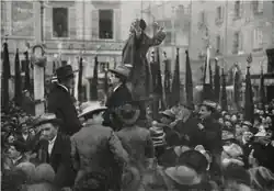 At the end of the strike, the Parma Royal Prosecutor's Office prosecuted the syndicalists, accusing them of having promoted and attempted an armed insurrection against the state during the strike. De Ambris was accused of being the head of the association and of throwing stones at a policeman from a window. In view of the tension that had built up between workers in the city and the countryside during the months of unrest, the trial was transferred from Parma to Lucca.[41] Among the defense lawyers for the accused syndicalists and workers were Arturo Labriola, Pietro Gori and some socialist deputies. The police themselves, a delegate and a commissioner, ended up defending the strikers, claiming that the movement had no insurrectionary character, but only an economic objective.[42] In May 1909, all the accused were acquitted and released. The prosecuted syndicalists and workers were welcomed with parties in Parma, where people carried portraits of Alceste De Ambris, Giuseppe Garibaldi and Jesus Christ.[43]