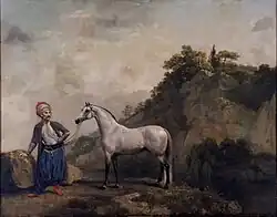 It was claimed in the 19th century that Sir Robert Sutton (1671–1746), English ambassador to the Ottoman Empire in Constantinople from 1700 to 1717, had acquired horses there, including Alcock's Arabian, the Holderness Turk, and the Brownlow Turk, and had had them shipped to England in 1704. However, there is no evidence that Alcock's Arabian was among these horses.[2] It is more likely that he was bred in England. Lady Wentworth of the Crabbet Arabian Stud researched the foundation sires and found some confusion due to horses' names changing as they changed owners. She eventually concluded that every imported grey stallion she could find sufficient information to review was the same horse as Alcock's Arabian. While it is true that the horse may have been known under several different names, including Pelham's Grey Horse, and Bloody Buttocks, if he was bred in England, as now believed, he could not have been the same horse as one imported. It has been claimed that the horse was imported early in the 18th century, but there is no firm evidence to support this assertion.[3] The General Stud Book lists Sir Watkin Wynn's Spot, a horse now accepted as having been sired by Alcock's Arabian, as: "...by a son of the Curwen Bay Barb (which was out of Sir J. Parsons's Old Wen Mare, sister to Clumsey)...", which is strong evidence. The Old Wen Mare may have been the same mare as the exceptional broodmare Grey Wilkes, and if not was probably her full sister.[3]