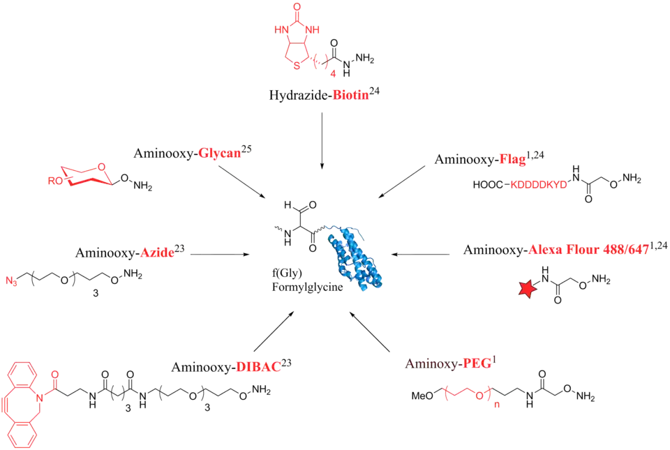 The aldehyde tag is a technique which recently found increased application because of the introduction of bioorthogonal chemical reporters. Bioorthogonal agents contain functional groups such as azides or cyclooctynes for coupling which are not naturally found in the cell. Due to their foreignness, they seem inert and do not disrupt the native metabolism,[3][7][9] Fig. 3 gives an overview of possible labeling methods for formylglycine. For example, it can be coupled to probes such as biotin or a protein tag like Flag that are useful for purification and detection.[3][1] Furthermore, fluorophores can be directly conjugated for live cell imaging.[22] The conjugation of polyethylene glycol (PEG) chains to potential drug candidates extends the stability against proteases in body fluids and at the same time reduces renal clearance and immunogenicity.[3] The first application described here, deals with the formation of protein-protein conjugates through bioorthogonal probes.[23] Since, the aldehyde tag is strictly speaking not a true bioorthogonal agent as it can be found in various metabolites, it can cause cross reactions during protein labeling.[16][23] However, coupling bioorthogonal probes such as azides or cyclooctynes can be applied to overcome this obstacle.[23] As a second application, the coupling of glycan moieties to proteins is presented here. It can be utilised in the strategy of chemically introduced glycosylation patterns.[24]