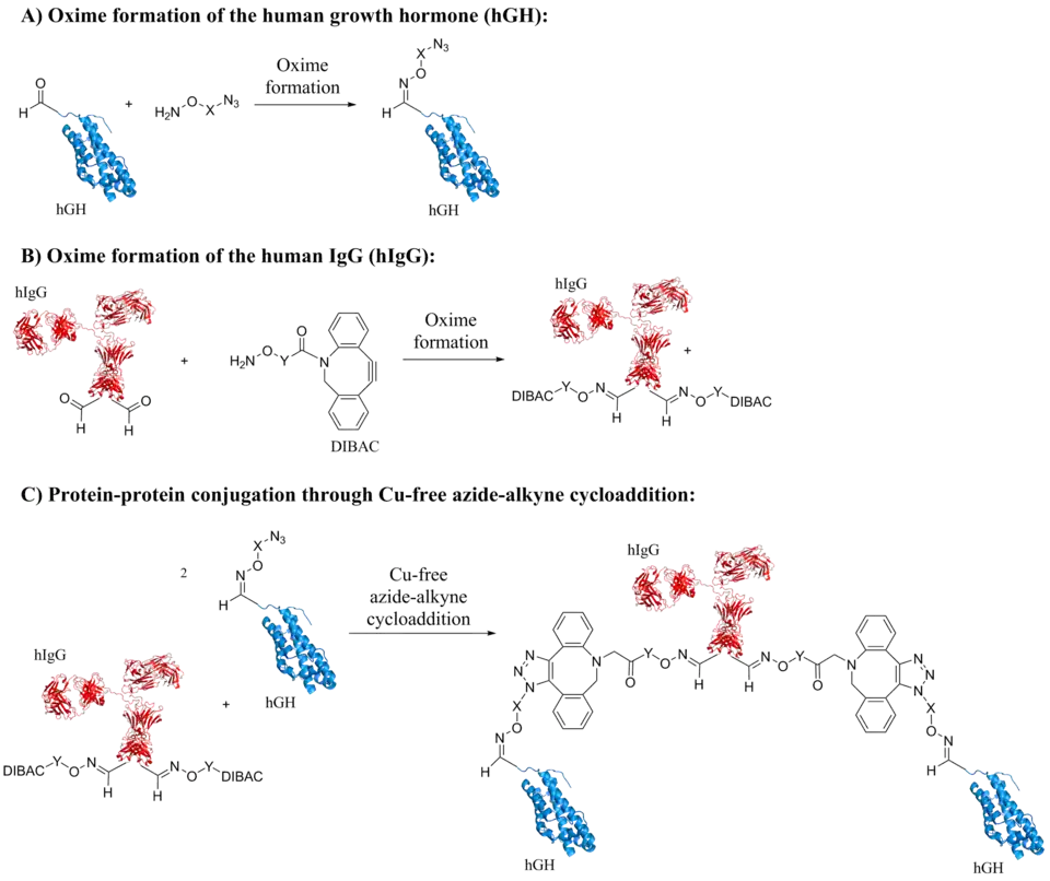 Studies have explored the strategy of producing protein-protein conjugates with the help of the aldehyde tag.[23] Their aim was to connect full length human IgG (hIgG) to the human growth hormone (hGH). These protein-protein conjugates can be superior to monomeric proteins in terms of serum half life in protein therapeutics and, additionally, have appealing dual binding properties.[24] In order to achieve protein fusion, the five-residue aldehyde tag (CxPxR) was incooperated into hIgG and hGH. In hIgG, the aldehyde tag was introduced at the C termini of the two heavy chains, resulting in two possible conjugation sites. FGE then oxidizes the cysteine residue to formylglycine (fGly) during protein expression. For the subsequent conjugation steps, the strategy of the copper-free click chemistry was selected. A strain-promoted 1,3-dipolar cycloaddition of a cyclooctynes and an azide was carried out forming a covalent linkage (also termed the Cu-free azide-alkyne cycloaddition).[23] Thus, the aldehyde bearing proteins react under oxime formation with different heterobifunctional linkers which carry an aminooxy residue on one end and either an azide or cyclooctynes on the other. This results in the attachment of hIgG to a linker containing a cyclooctyne (here dibenzoazacyclooctyne (DIBAC)) and hGH to a linker holding an azide function (Fig.: 2A and B). The proteins hGH and hIgG were also treated with DIBAC-488, azide Alexa Fluor 647 and analysed by SDS-PAGE and Western blot to validate oxime formation. Next, the DIBAC-hIgG and azide-hGH derivatives are joined by Cu-free click chemistry (Fig.: 2C). The resulting fusion proteins were purified and analyzed by immunoblot (see Hudak et al. 2012).