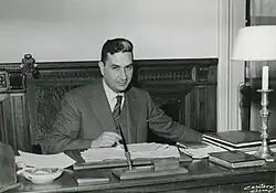 In the 1953 Italian general election, Moro was re-elected to the Chamber of Deputies, where he held the position of chairman of the DC parliamentary group.[30] In 1955, was appointed as Italian Minister of Grace and Justice in the first Segni government led by Segni as Prime Minister of Italy.[31] In 1956, he was among the most popular candidates, receiving the most votes during the party's congress. In May 1957, the PSDI withdrew its support to the government and Segni resigned on 6 May 1957.[32]