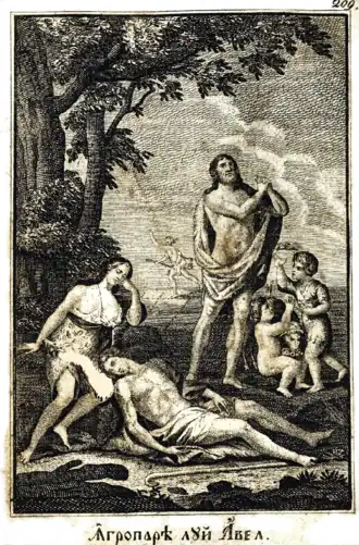 By late 1817, Beldiman had completed his own version of Voltaire's Oreste, which was only published in 1820.[49] He soon signed contracts with the Wallachian publisher, Zaharia Carcalechi, who was active in the literary circles of Habsburg Hungary.[50] In 1818, Beldiman also put out Învățătură sau povățuire pentru facerea pâinii ("A Guide or Advisor to Bread-making"), ultimately based on a text by Christian Albert Rückert, but directly translated from the Greek version penned by Dimitrios Samurkasis (Dimitrie Samurcaș).[51] Also that year, Beldiman completed a translation of Salomon Gessner's Der Tod Abels, from the French intermediary. It was published at Buda as Moartea lui Avel.[52] Through his presence in the Habsburg realm, Beldiman was in contact with the "Transylvanian School", represented by poets such as Ion Budai-Deleanu. As a result, Iorga attributed to Budai-Deleanu a manuscript-poem called Menehmii sau frații de gemene, later discovered to have been Beldiman's translation of Jean-François Regnard's Les Ménechmes.[53]