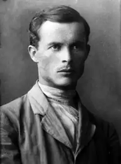 Although his parents were uneducated, Dovzhenko's semi-literate grandfather encouraged him to study, leading him to become a teacher at the age of 19. He avoided military service during World War I because of a heart condition, but during the Civil War he may have served for some time in the army of the Ukrainian People's Republic.[5] In 1919 in Zhytomyr he was taken prisoner and sent to the prison on suspicion of intelligence for the UPR army. At the end of 1919, he was released at the request of Vasyl Ellan-Blakytny. After his release, for some time he taught history and geography at the officers' school of the Red Army. In 1920 Dovzhenko joined the Borotbist party. He served as an assistant to the Ambassador in Warsaw as well as Berlin. Upon his return to USSR in 1923, he began illustrating books and drawing cartoons in Kharkiv. At that time, Dovzhenko was also a member of VAPLITE.