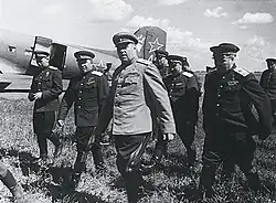 While at the Directorate of Military Training, Vasilevsky supervised the Red Army's training and worked on military manuals and field books. He also met several senior military commanders, such as Mikhail Tukhachevsky and Georgy Zhukov, then the Deputy Cavalry Inspector of the Red Army. Zhukov would later characterize Vasilevsky as "a man who knew his job as he spent a long time commanding a regiment and who earned great respect from everybody."[31] In 1934, Vasilevsky was appointed to be the Senior Military Training Supervisor of the Volga Military District (Privolzhsky voyenny okrug).[6] In 1937, he entered the Academy of the General Staff,[32][33] where he studied important aspects of military strategy and other topics under experienced generals, including Mikhail Tukhachevsky.[34]