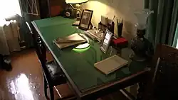 In the modern memorial exposition of the house museum there is an office of the eldest son of Aleksandr Arbuzov — academician Boris Arbuzov. The exposition presents his personal belongings: a desk, a bookcase, landscape photo sketches made by Boris Alexandrovich (he was fond of photography), in the showcase you can see his commemorative medals and awards.[79] The academician's camera and photographic enlarger are on display. The modern interior differs from the time when Boris Alexandrovich lived here. Then all the walls were filled with bookshelves.[78] Boris Arbuzov read a lot, both fiction and researches. Lyalya Yuldasheva recalled that after reading a book about Mayan culture in the evening, he would talk about his impressions of it the next morning.[80][Notes 7][81]