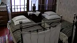 The bedroom is characterised by its asceticism. Its interior is completely preserved: two modest beds, a folding screen, wardrobes, a marble washbasin, a commode, a table on which stands a typewriter. In the room there is also a sewing machine of the American company Singer, for which the academician's wife worked.[82][83] Ekaterina Arbuzova herself was involved in the children's education, gave them lessons and taught them French, which she knew perfectly.[82] The death of his wife in 1962 was a heavy blow for the academician. He resigned from the Institute of Chemical Technology and began to withdraw from scientific activity.[84] In the last years of his life Aleksandr Arbuzov spent a lot of time in this room. He read a lot, especially magazines and works of 19th century Russian literature. Books and Soviet magazines are displayed on a shelf in the exposition.[82]