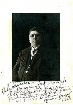 The Sistine Chapel Choir was run on centuries old traditional lines with a strict system of hierarchies. In 1886, the senior castrato, Giovanni Cesari, retired, and it was probably then that Moreschi took over as Direttore dei concertisti (Director of soloists).[11] In 1891 Moreschi took his turn as segretario puntatore, being responsible for the day-book of the choir's activities, and the following year was appointed maestro pro tempore, a largely administrative post concerned with calling choir meetings, fixing rehearsals, granting leave of absence and the like. During this year, Alessandro was also responsible for overseeing the choir's correct performance of its duties in the Sistine Chapel. Artistically speaking, the job involved choosing soloists and in developing repertoire. This period was one of disruption within the Sistine choir's organisation as well as Catholic church music at large as the reforming movement known as Cecilianism, which had originated in Germany, began to influence Rome. Its calls for the Church's music to return to the twin bases of Gregorian chant and the polyphony of Palestrina threatened both the repertoire and the practice of the Sistine Chapel. Mustafà also appointed Lorenzo Perosi as joint Perpetual Director, a 26-year-old priest from Tortona in Piedmont and a supporter of Cecilianism. Moreschi was a witness to the struggles between the two movements, but was also involved in secular matters: on 9 August 1900, at the express request of the Italian royal family, he sang at the funeral of the recently assassinated king, Umberto I, despite the Papacy still having no formal contact with the unified Italian secular state, which it regarded as a usurper.[12]