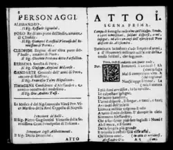 The libretto offers a typical example of the hierarchy of roles in an opera from around 1730. At the top is the ruler, here Alessandro. He is opposed by the first pair of lovers Cleofide and Poro. A second pair, Erissena and Gandarte, and the traitor Timagene, are subordinate to these figures. Each person embodies a different character type. The magnanimous Alessandro opposes the treacherous Timagene, and the couples also complement each other with their contrasting main features: the jealous Poro combines with the faithful Cleofide, the reliable Gandarte with the coquettish Erissena.[6][1]