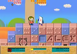 The arcade and Master System versions are similar, aside from graphics and sound. The arcade version has a limited number of lives (three by default), whereas the Master System version has infinite lives, though being hit or falling into a pit subtracts seconds in the timer and backtracks the player to the last checkpoint in the round. The arcade version features a cooperative two-player mode, with the second player assuming the control of a female counterpart to Alex Kidd named Stella.