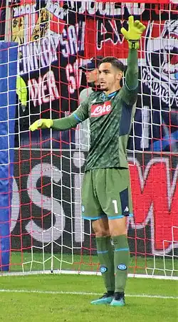 During his first two seasons with Napoli, he was frequently used in a rotational role alongside David Ospina. However, under the club's new manager Gennaro Gattuso, he found himself relegated to the bench until the season break due to the COVID-19 pandemic in March 2020. The coach favoured the Colombian shot-stopper due to his superior ability with the ball at his feet.[12][13] Following a suspension to Ospina, Meret started in the 2020 Coppa Italia Final against Juventus on 17 June. After a goalless draw in regulation time, Meret saved Paulo Dybala's spot kick, contributing to his team's 4–2 penalty shoot-out victory.[14] Subsequently, Meret found himself back in rotation with Ospina, starting about half of the matches until the end of the season. This rotational role continued into the following 2020–21 season, with Ospina and Meret alternating every other match in the Europa League, Serie A, and Coppa Italia.[15] However, in the next season, Meret assumed the role as the second goalkeeper in the league for the majority of the season under the new coach Luciano Spalletti. He was the first-choice keeper in the UEFA Europa League and the Coppa Italia.