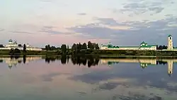 Both monastery compounds as seen from the Lake Roshchinskoye