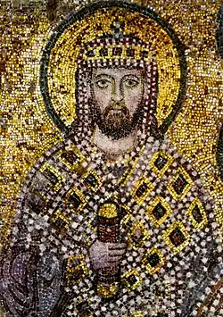 ![]() Mosaic of Emperor Alexander in Hagia Sophia. He wears a loros and holds the akakia in his right hand. | |||||