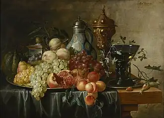 His still-life paintings are generally more varied and crowded than those of his master de Heem. He also preferred dramatic light effects in artificial settings which contrasts with de Heem's use of harmonious colour patterns and subtle tonalities to create an illusion of naturalness.[5] His residence in Italy clearly influenced his style.[6]