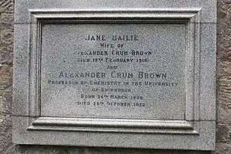 Alexander Crum Brown was born at 4 Bellevue Terrace[1] in Edinburgh. His mother, Margaret Fisher Crum (d. 1841), was the sister of the chemist Walter Crum, and his father, Rev Dr John Brown (1784-1858), was minister of Broughton Place Church[2] in the east end of Edinburgh's New Town. Crum Brown was baptised on 6 May 1838.[3][4] His half brother was the physician and essayist John Brown.
