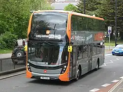 The Stagecoach Group, the founders of which were shareholders of Alexander Dennis until 2019,[4] operate a large number of Enviro400 MMCs across the group's operations in England, Wales and Scotland. Outside London, some of the largest fleets are in service with their Manchester and Merseyside and South Lancashire subsidiaries.[5][6][7] Most have been delivered to the company's standard single-door specification, but there have been some exceptions: at Stagecoach East Midlands, six Enviro400 MMCs entered service on Lincolnshire InterConnect cross-county services in November 2017 in a purple variation of the standard Stagecoach livery,[8] while fourteen Enviro400 MMCs entered service at Mansfield and Workshop depots between 2018 and 2020 for the Nottingham to Chesterfield 'Pronto' service.[9][10] Stagecoach East introduced 22 dual-door Enviro400 MMCs painted in colour-coded liveries to Cambridge's park & ride network in 2017,[11][12] while Stagecoach Bluebird introduced eight branded Enviro400 MMCs equipped with luggage racks to its 'JET 727' service to Aberdeen Airport,[13] and 12 branded examples were introduced to Stagecoach Cumbria & North Lancashire's scenic 'The Lakes Connection 555' service in the Lake District in 2016;[14] these were replaced by nine Enviro400 MMCs with improved interiors in April 2023.[15] Enviro400 MMCs for Stagecoach Gold services began to be delivered from 2016 onwards; examples have entered service with Stagecoach South, Stagecoach Yorkshire, Stagecoach West and Stagecoach Merseyside & South Lancashire.[16][17][18][7]